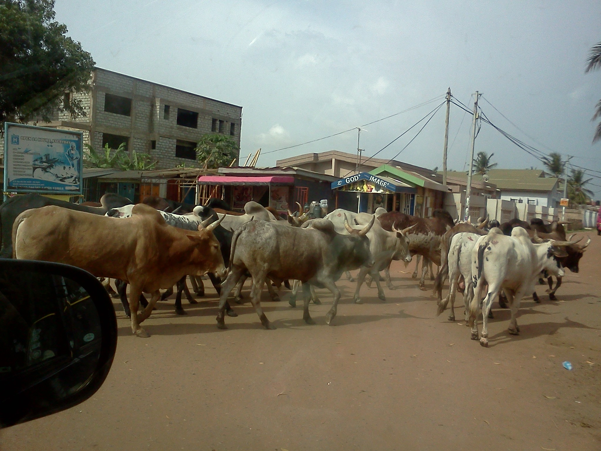 There are several animals in Ghana. I did not get to see the monkeys, elephants, zebras, and giraffes, but I learned that they have nature reserve parks in different regions where I can go see them. Everyday I did encounter many cows, goats, chickens, dogs, cats, and sheep freely roaming around the streets and in harmony with each other.
